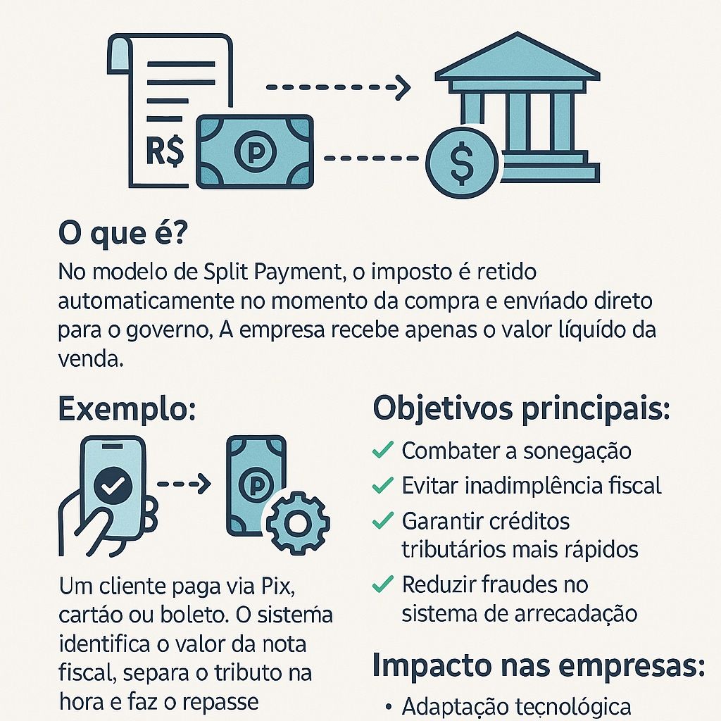 📅 A previsão é que o Split Payment comece a ser testado em 2026, com base nos novos tributos CBS e IBS.